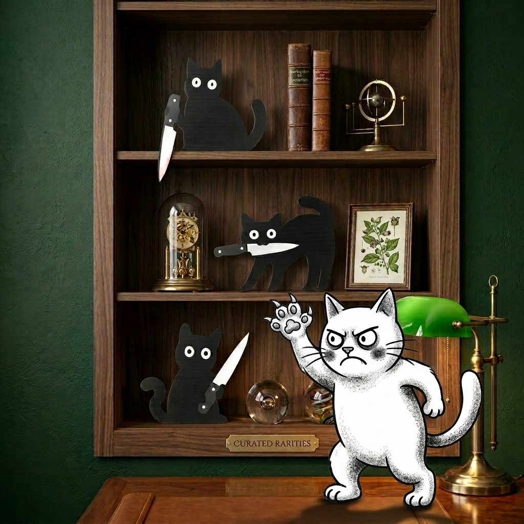 The Opening Rant: The Hooman, in an act of what I can only describe as aggressive artistic misrepresentation, has mounted three wooden silhouettes of my kind onto the entryway wall. They are holding knives. The listing calls this a “humorous twist.” I call it a confession. Because I have knocked exactly seventeen things off the counter this week alone — a glass of water, a pen, a lip balm, two hair ties, an apple, and what appeared to be a very important document — and I did ALL of it with nothing but my bare paws and a complete moral absence of remorse.